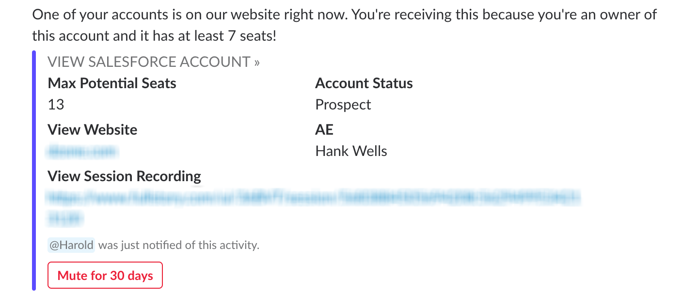 Salesforce routes the lead accordingly, and sales reps in that territory receive a Slack notification that a new lead is on the site. They can also check the territory’s Slack channel, which logs visitor activity, enabling reps to see which pages leads in that territory have looked at.
