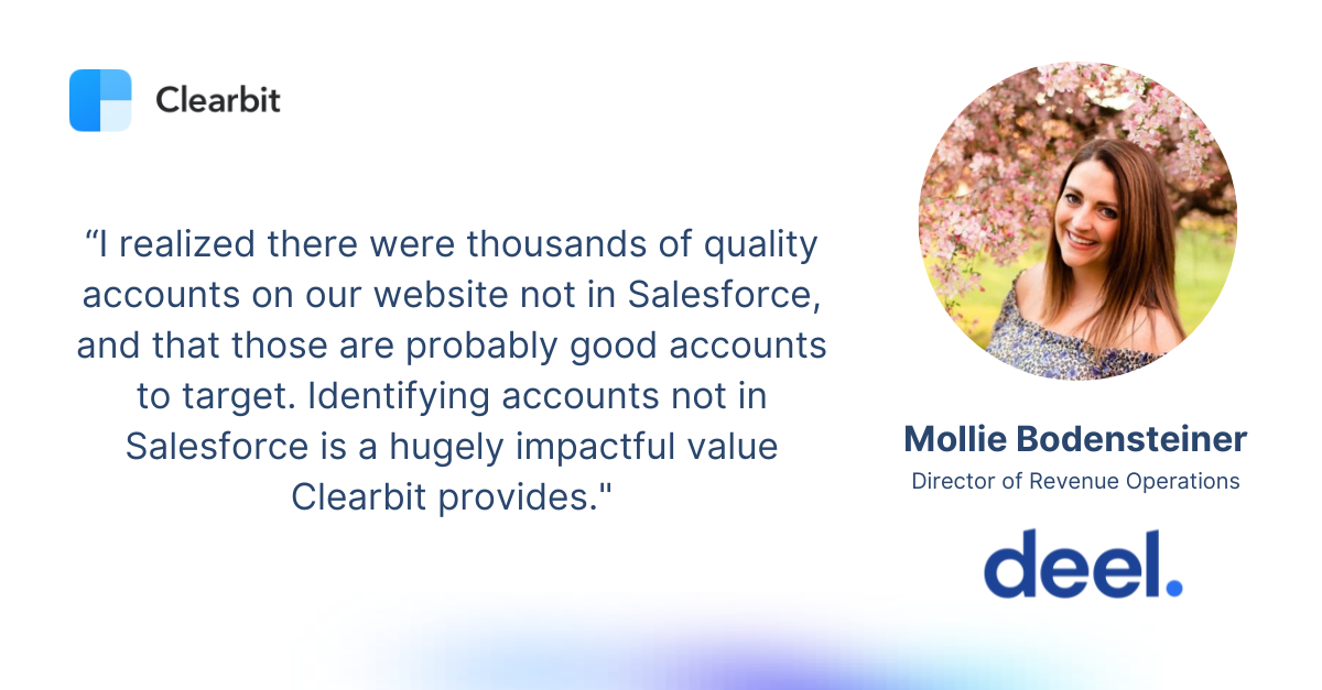 “I realized there were thousands of quality accounts on our website not in Salesforce, and that those are probably good accounts to target,” says Mollie. “Identifying accounts not in Salesforce is a hugely impactful value Clearbit provides,” she continues. With a large volume of untapped accounts, Mollie saw an opportunity to help sales conduct more efficient and relevant outreach.